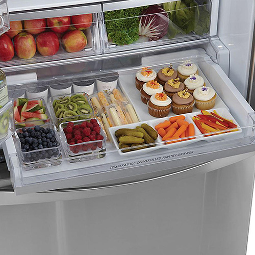 French door refrigerator generous door storage adjustable tempered glass shelving and a full width pantry drawer give you and the family plenty of space to keep fresh produce deli meats snacks.